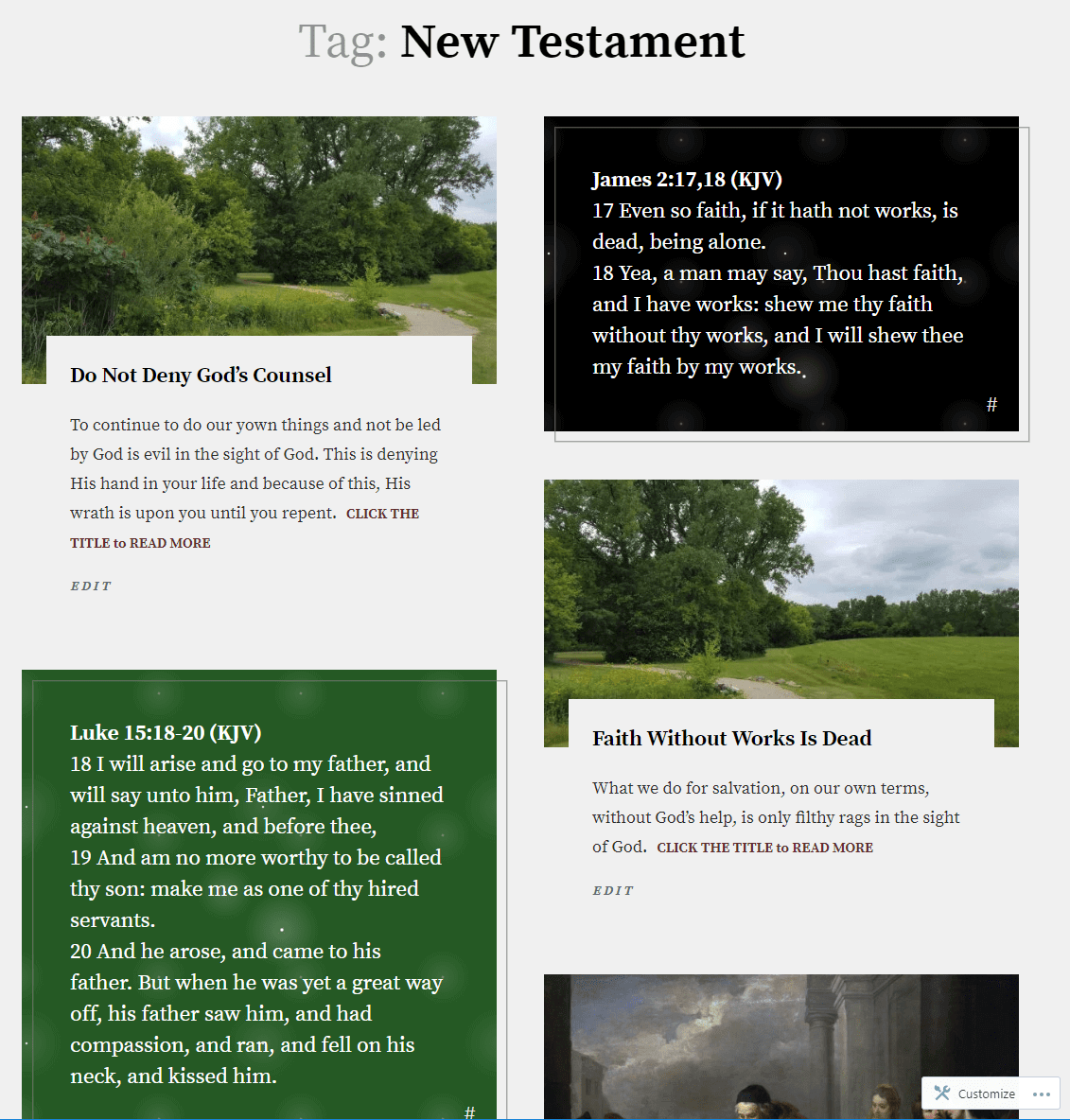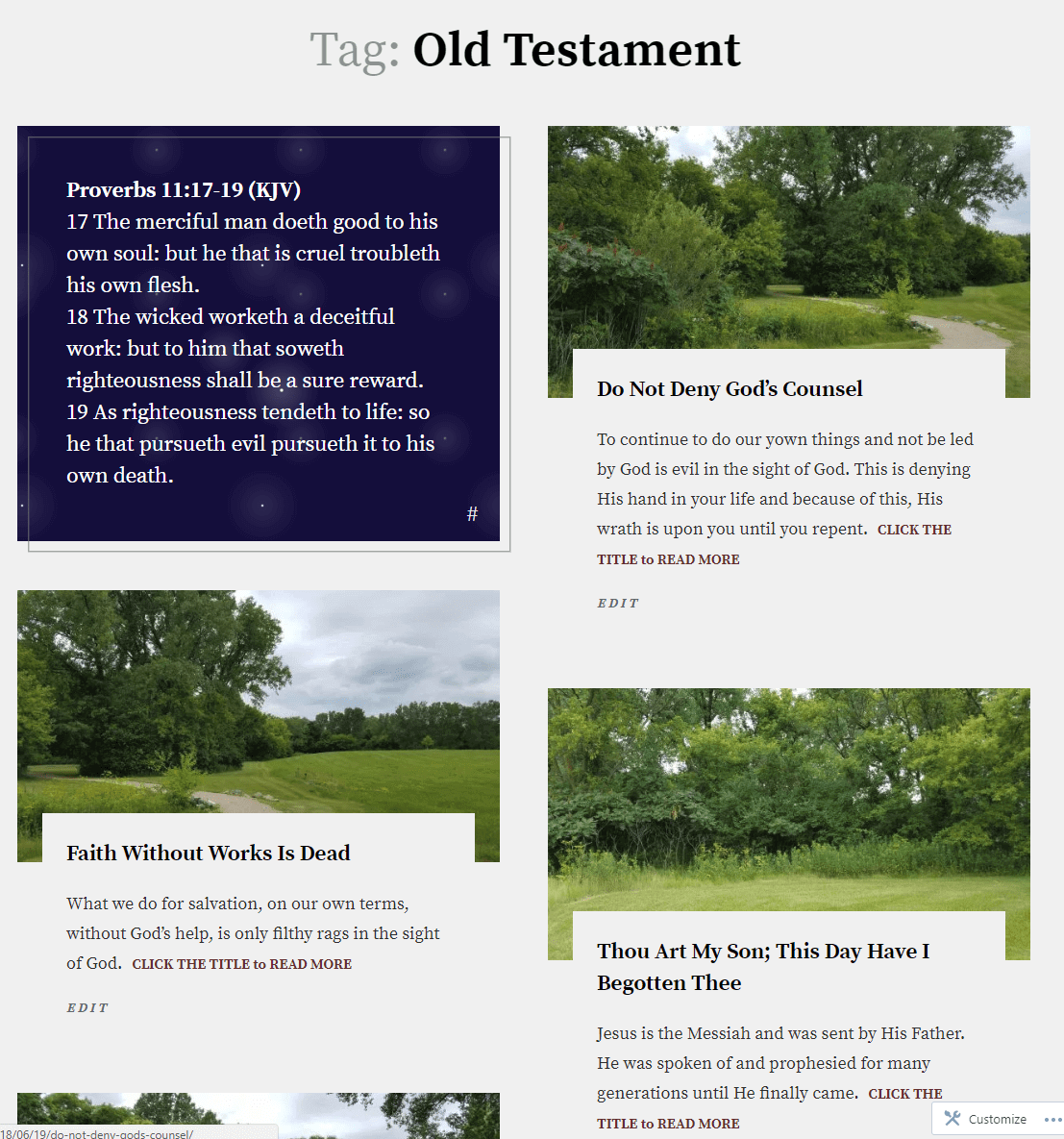 On the Bible page, you can now click on “Old Testament” and get all the daily scriptures and daily devotionals that are within the Old Testament. The same can be said by clicking on “New Testament“. By doing this, you will get all the daily scriptures and daily devotionals within the New Testament. So if you are studying the Old or New Testament for this year, you can get more content for that part of the Bible more easily. Lately, the devotionals have had both old and new testament scriptures in them but there are times when I only use Old or New Testament scriptures. The daily scriptures are always relevant to either Old or New Testament. Anyhow, with that being said, click the links below and let me know what you think. To God be the glory. God bless you.